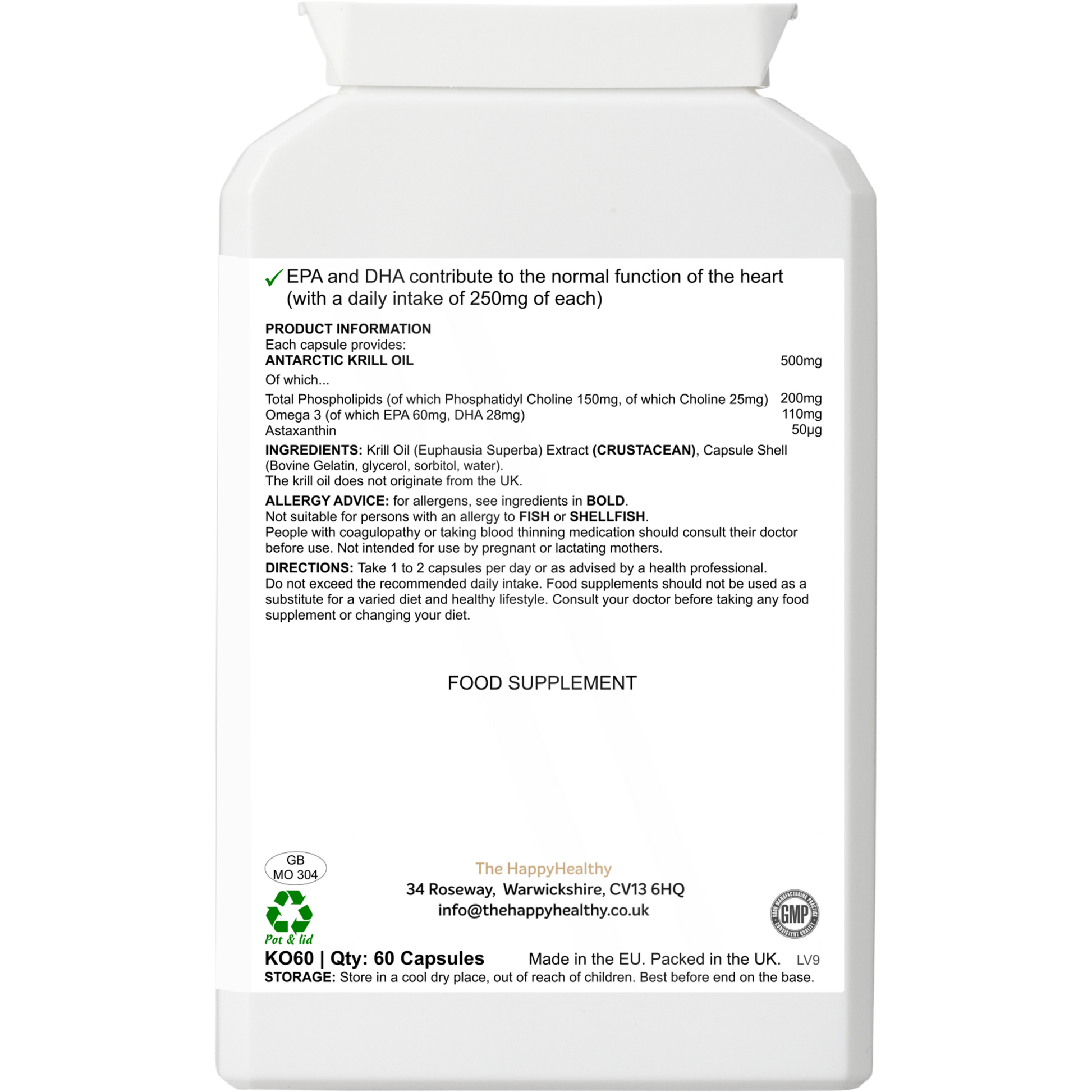 HappyHealthy's Omega 3 Krill Oil (Euphausia superba) is a natural source of high concentration omega 3 oil, the powerful antioxidant astaxanthin, as well as high levels of phospholipids - a fundamental component of human cell membranes. It contains two types of Omega 3 fatty acid: eicosapentaenoic acid (EPA) and docosahexaenoic acid (DHA).