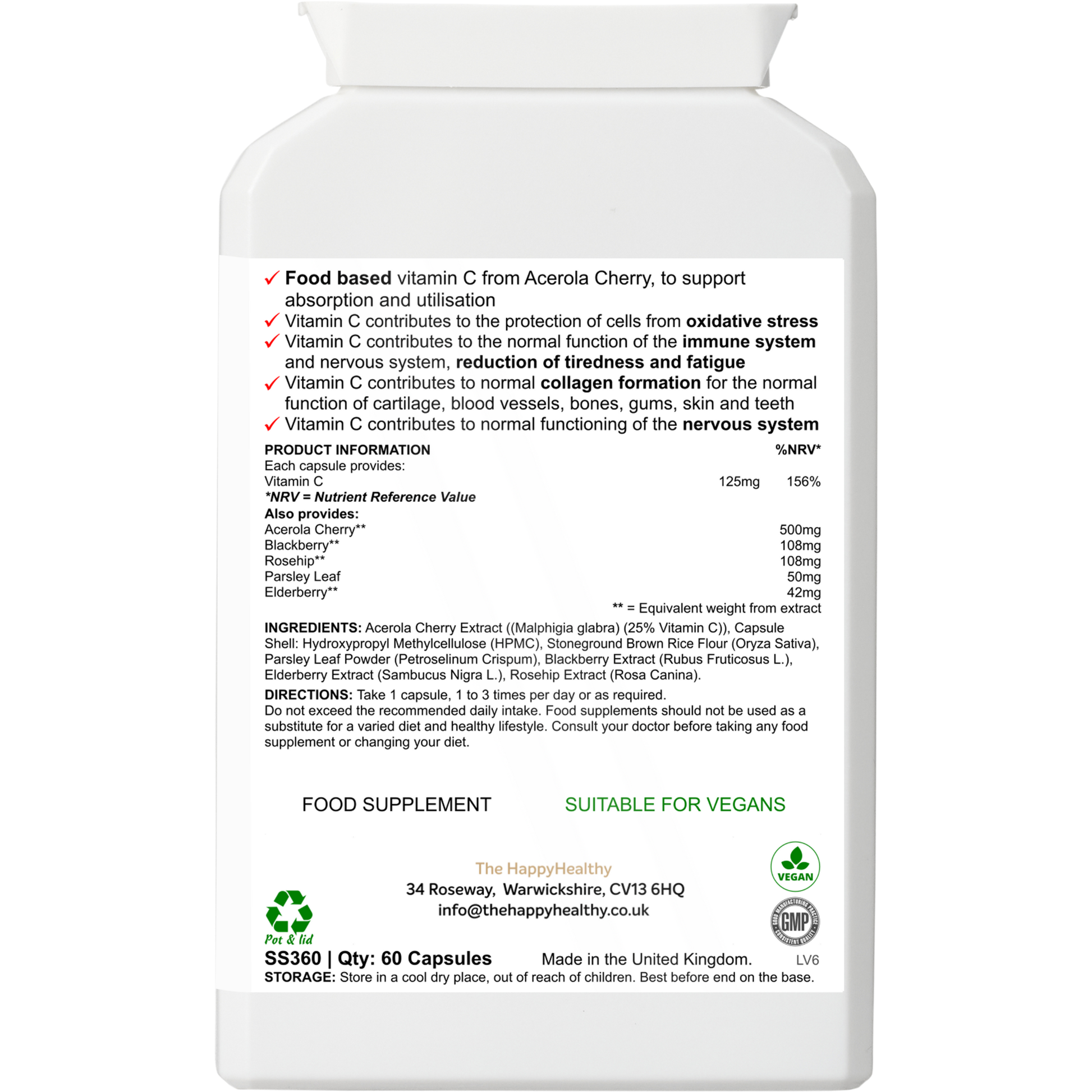 HappyHealthy Ultra Absorb VitC is a combination food state vitamin C supplement, derived from some of nature’s richest sources of this essential vitamin and antioxidant: Acerola cherry, rosehip, blackcurrant, parsley leaf and elderberry.